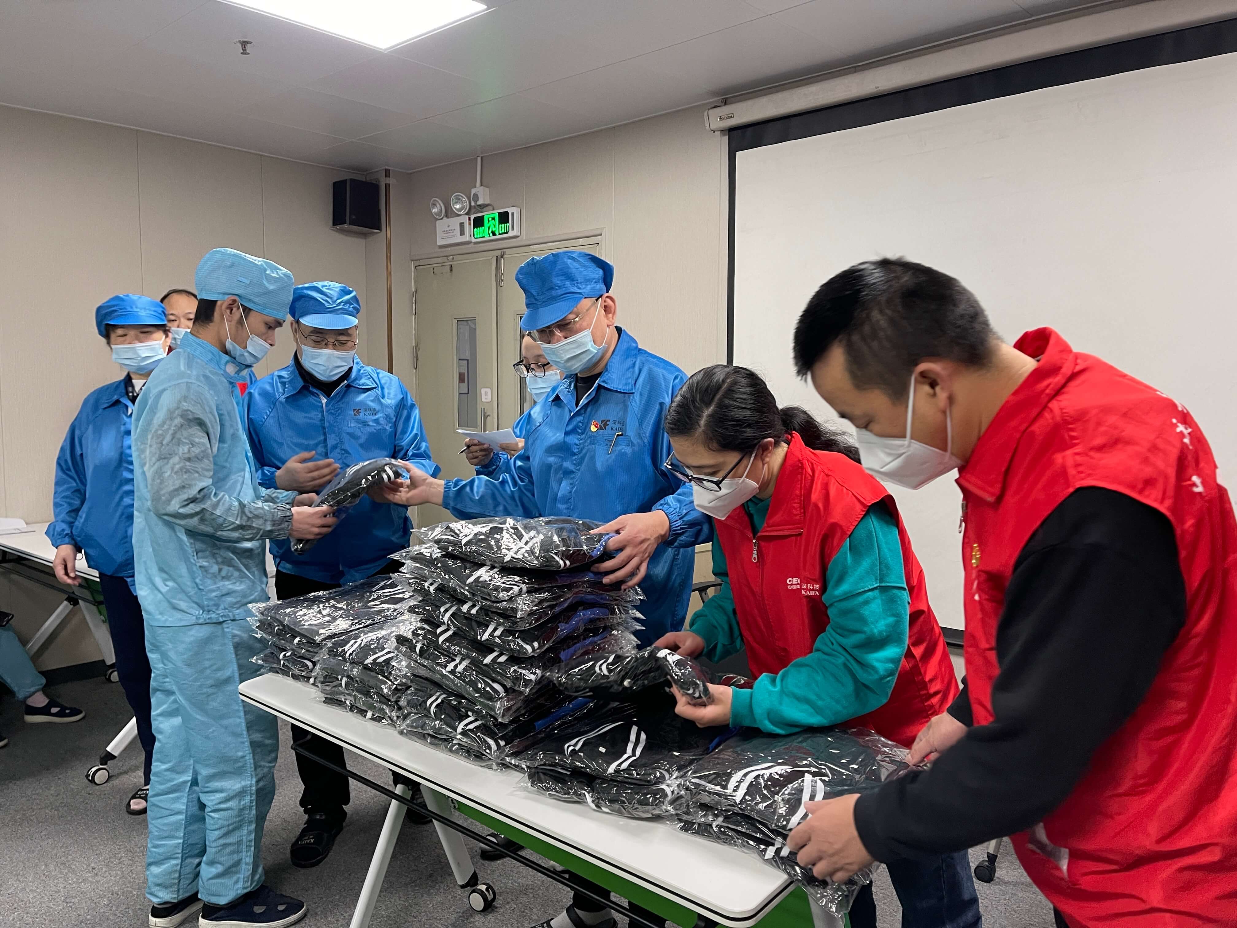 既送清凉,又送温暖。进入封控管理的第4天,深圳石岩的天气由温热骤然到冰凉,前几日发出的“送清凉”T恤43件已不能御寒,公司工会连夜整备“送温暖”长袖会员服及厚装马甲57件,发放给仅穿短袖的产线员工、工业园管理处、政府派驻人员。