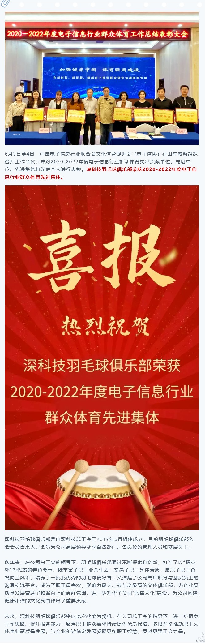 PA集团官网羽毛球俱乐部荣获2020-2022年度电子信息行业群众体育先进集体